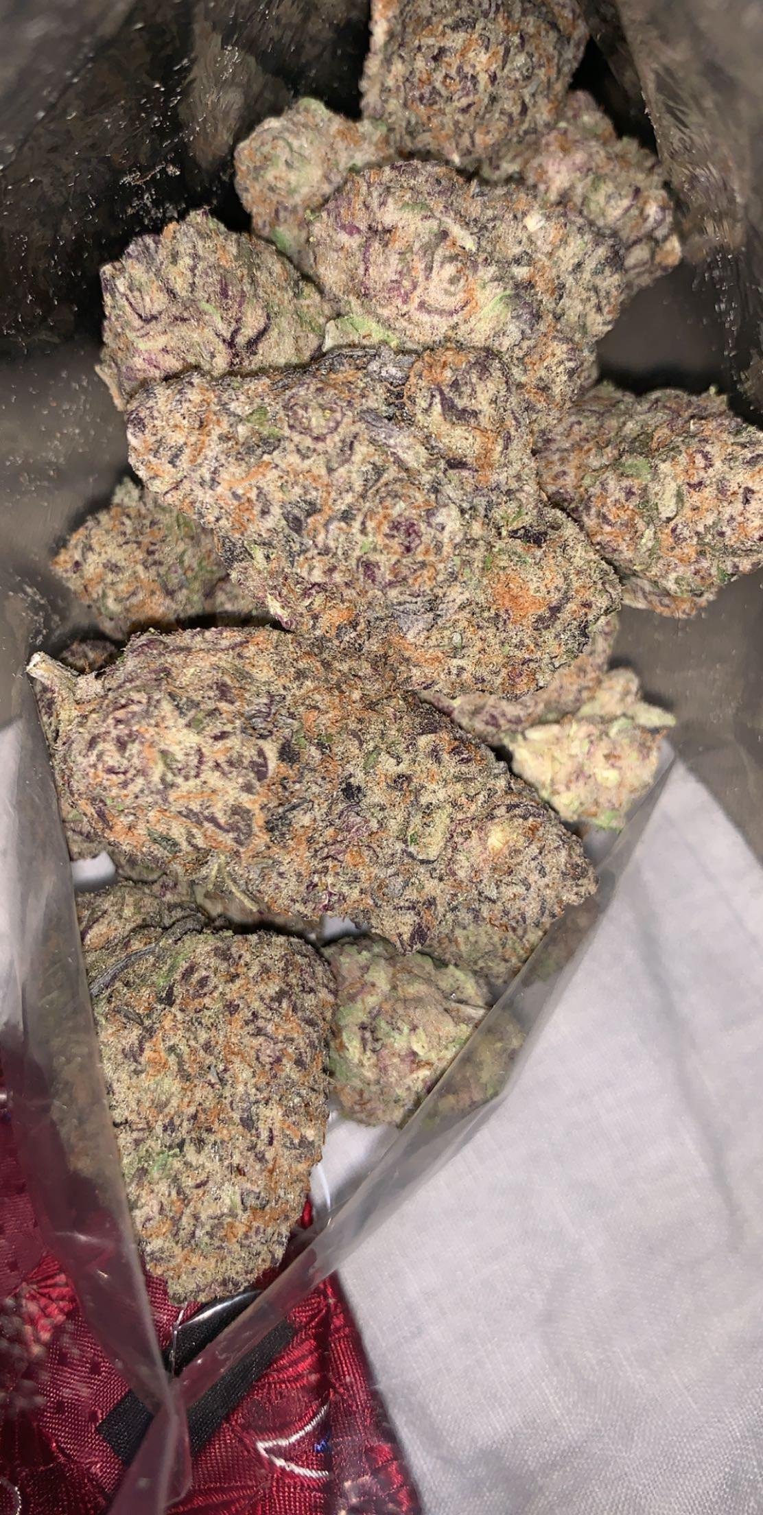 Buds: GSC buds are dense, thick, and sticky, with dark olive green colors highlighted by purple and orange hues. They are covered in a thick layer of frosty trichomes, which contribute to their potency.